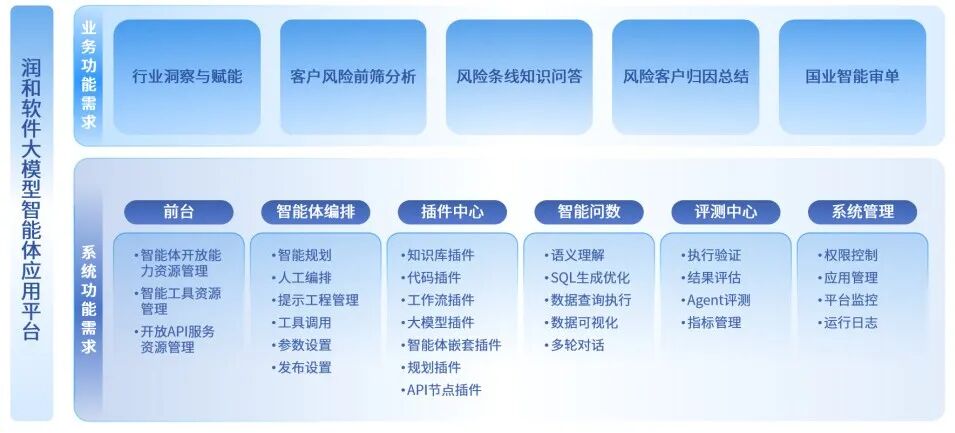 润和软件深耕金融科技十余载,已累计服务超过300家金融企业客户,对农商行的业务模式、运营痛点及转型需求具备深刻洞察。基于对某农商行业务规模、发展阶段与战略目标的全面分析,润和软件为其量身打造大模型智能体应用平台,充分融合业务需求,系统性地响应其在流程优化、风控升级与效能提升方面的核心诉求。